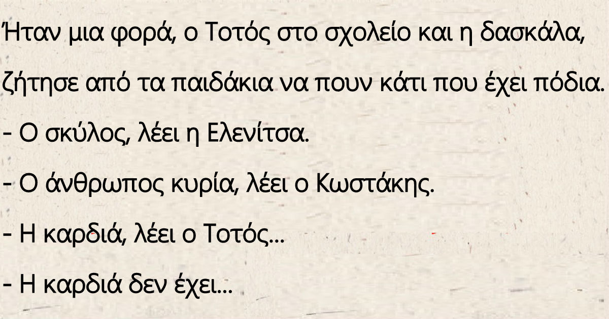 Ήταν μια φορά, ο Τοτός στο σχολείο και η δασκάλα ζήτησε από τα παιδάκια να πουν κάτι που έχει πόδια. by Newsroom 07.11.2019 16:19 written by Newsroom