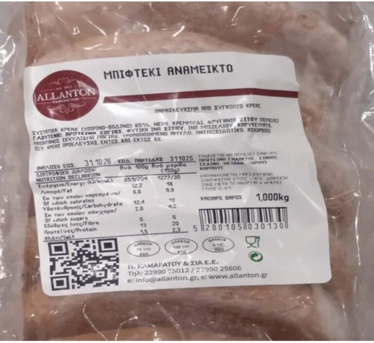 Πρόκειται για το προϊόν «ΜΠΙΦΤΕΚΙ ΚΑΤΕΨΥΓΜΕΝΟ» με κωδικό παρτίδας 31102025 και ημερομηνία ανάλωσης έως 31.10.2026, που παράγεται από την επιχείρηση «Π.ΚΑΜΑΡΑΤΟΥ & ΣΙΑ ΕΕ».