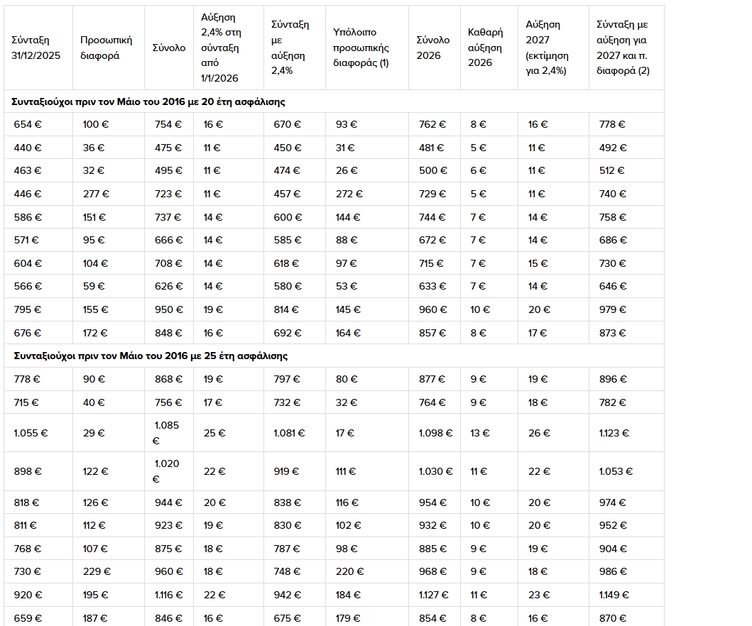 Οι συντάξεις με προσωπική διαφορά μετά τις αυξήσεις για το 2026 και το 2027