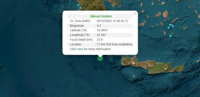 Σεισμός μεγέθους 4,2 βαθμών της κλίμακας Ρίχτερ σημειώθηκε στη θαλάσσια περιοχή ανάμεσα στη δυτική Κρήτη και τα Αντικύθηρα το απόγευμα της Παρασκευής (05.12.2025).