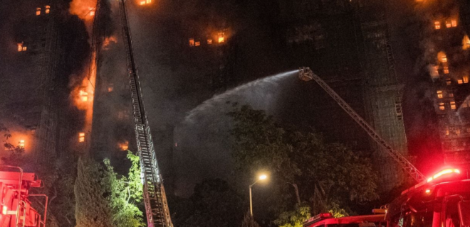 Πυροσβέστες αγωνίζονταν για την κατάσβεση της πυρκαγιάς, ενώ πυκνός μαύρος καπνός υψωνόταν πάνω από τους πύργους των 31 ορόφων, με τις φλόγες να φωτίζουν τον νυχτερινό ουρανό.