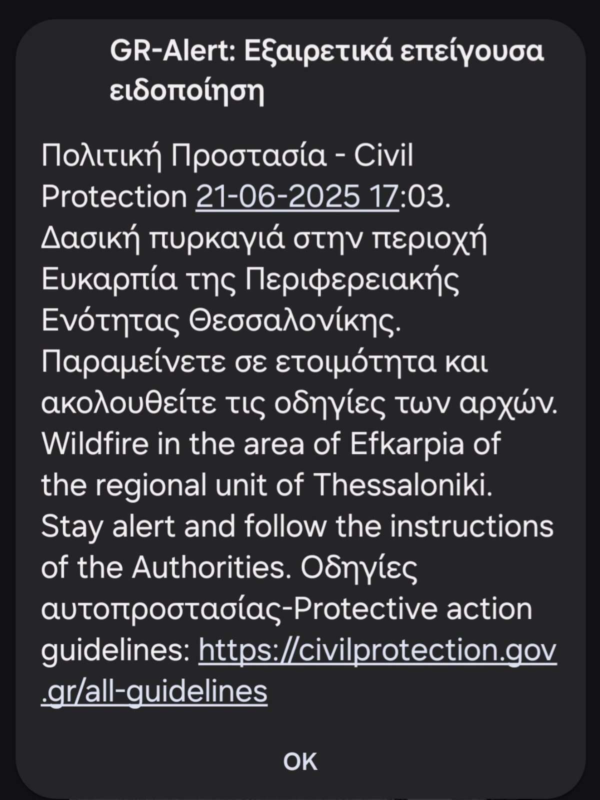 Εστάλη και προειδοποιητικό μήνυμα από την Πολιτική Προστασία προς τους κατοίκους της ευρύτερης περιοχής
