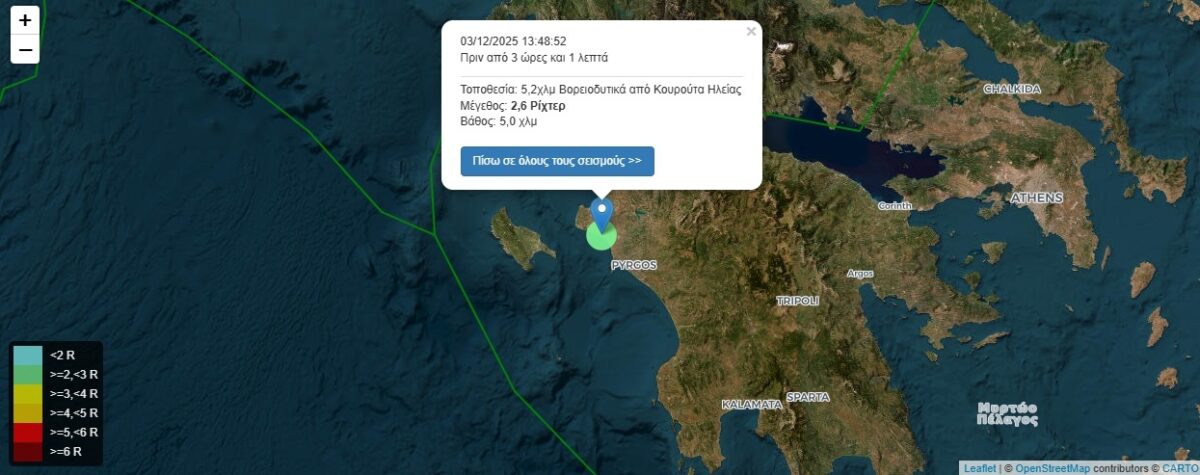 Σεισμός 2,6 Ρίχτερ 5,2χλμ Βορειοδυτικά από Κουρούτα Ηλείας στις 03/12/2025