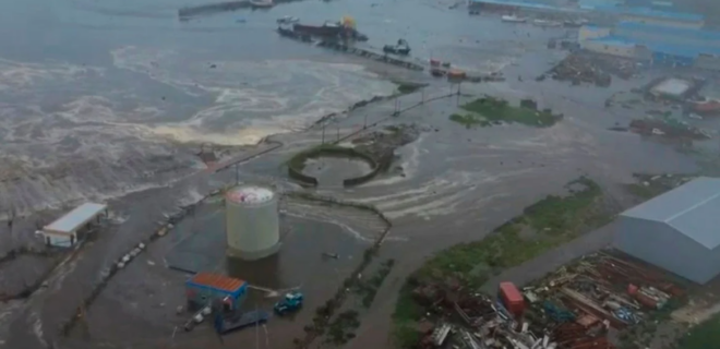 Βίντεο που μεταφορτώθηκαν σε ιστότοπους κοινωνικής δικτύωσης εικονίζουν ορμητικά νερά καθώς εισέβαλαν σε ακίνητα στην πόλη Σέβερο-Κουρίλσκ, ο πληθυσμός της οποίας απομακρύνθηκε εσπευσμένα.