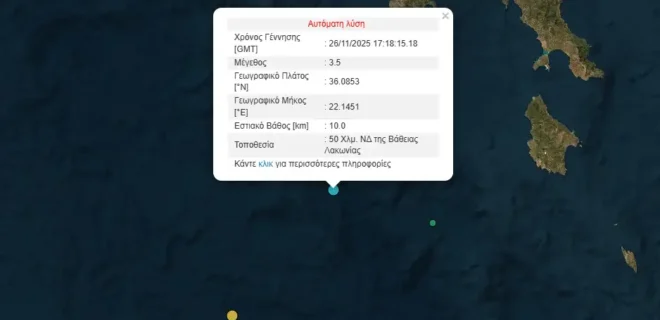Σεισμός μεγέθους 3,5 Ρίχτερ σημειώθηκε το απόγευμα της Τετάρτης στη Λακωνία, προκαλώντας ήπια ανησυχία στους κατοίκους της περιοχής. Η δόνηση καταγράφηκε στις 19:18, σύμφωνα με τα δεδομένα του Γεωδυναμικού Ινστιτούτου του Εθνικού Αστεροσκοπείου Αθηνών.