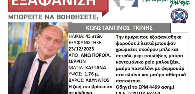 Ραγδαίες είναι οι εξελίξεις στην υπόθεση της εξαφάνισης του Κωνσταντίνου Γκίνη, διοικητή του Πυροσβεστικού κλιμακίου Άνω Ποροΐων, τα ίχνη του οποίου αγνοούνται από το πρωί της Τρίτης.