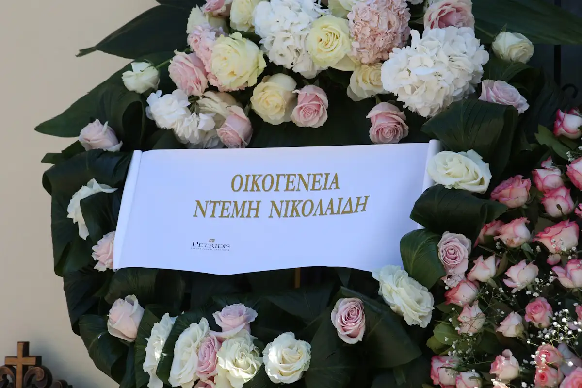 Στην εκκλησία έφτασε ο σύντροφος της εκλιπούσας μαζί με την κόρη του Μελίνα Νικολαΐδη και η στενή της φίλη, Κατερίνα Καινούργιου κρατώντας ένα λευκό τριαντάφυλλο. Στο πλευρό του Ντέμη Νικολαΐδη, οι Αντώνης Νικοπολίδης, Κώστας Κατσουράνης και Γιώργος Καραγκούνης.