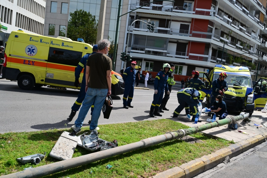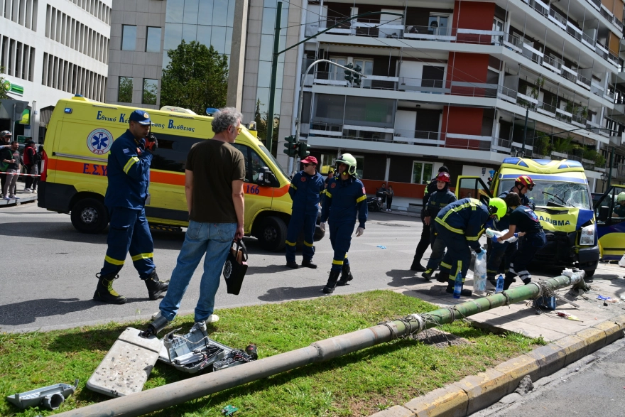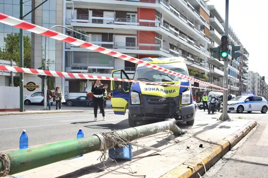 Πανικός στο Παγκράτι: Ασθενοφόρο συγκρούστηκε με ΙΧ και έπεσε σε κολώνα – Δύο πεζοί τραυματίες