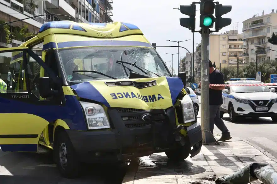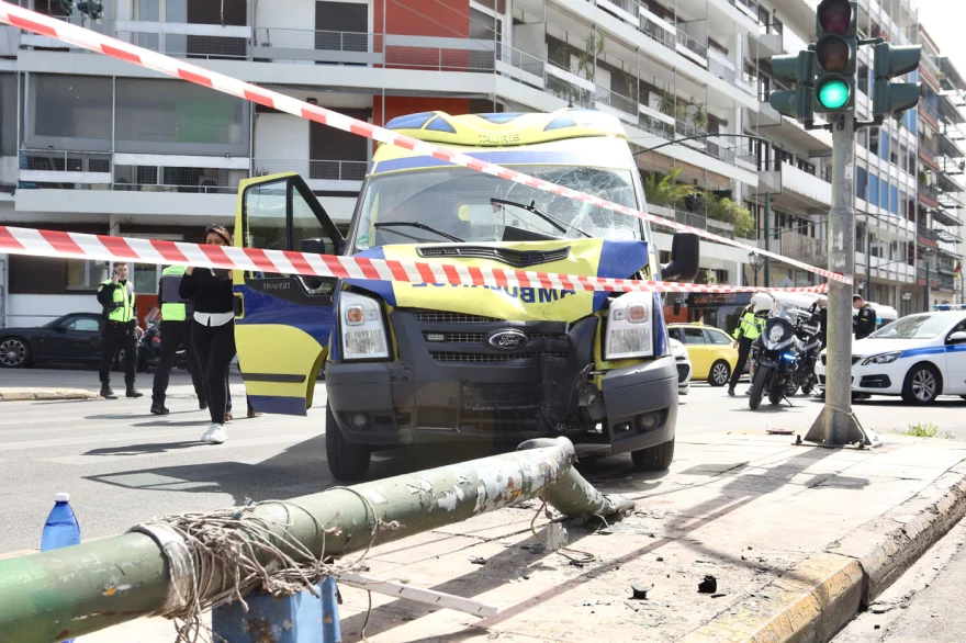 Το τροχαίο σημειώθηκε στη συμβολή των οδών Βασιλέως Γεωργίου Β’ και Βασιλέως Κωνσταντίνου – Τραυματίστηκε ένα ακόμη άτομο που επέβαινε στο ασθενοφόρο, πιθανότατα συνοδός του τραυματία που μετέφερε το όχημα