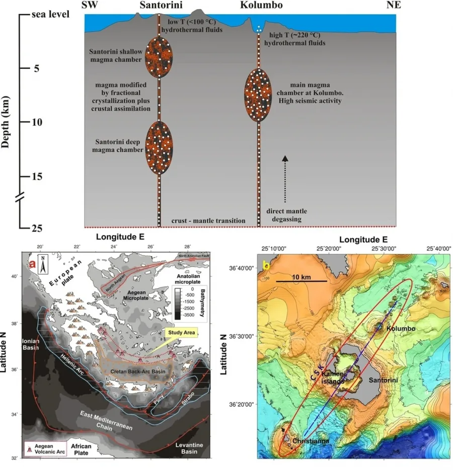 Η Ελλάδα βρίσκεται πάνω από αυτό που ονομάζεται επίπεδο βύθισης: το Ιόνιο και το τμήμα αμέσως βόρεια της Λιβύης και της Αιγύπτου εισχωρούν κάτω από την Ελλάδα, την Κύπρο και την Τουρκία. Αυτό το φαινόμενο καταβύθισης προκαλεί σεισμικότητα και ταυτόχρονα ηφαιστειακό ζήτημα. Η λιθόσφαιρα προκαλεί σε ένα ορισμένο σημείο μια απελευθέρωση υγρών, τη σύντηξη των υποκείμενων πετρωμάτων και επομένως την άνοδο του μάγματος που έχει δημιουργήσει τα ηφαίστεια που πηγαίνουν από το βουνό Amiata στα ηφαίστεια του Λάτσιο, όπως το Bracciano και τους λόφους Alban, και στη συνέχεια ο Βεζούβιος, για να φτάσουν στα Αιολικά νησιά, τα οποία είναι ακριβώς παρόμοια με την υποκατηγορία της Ιταλίας, ανατολικά, δημιουργεί όλα τα ηφαίστεια του Ελληνικού τόξου, και η Σαντορίνη είναι ένα από αυτά, όπως και το υποθαλάσσιο ηφαίστειο Κολούμπο κοντά.