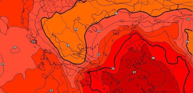 Μάλιστα βλέπω πως οι τιμές της αέριας μάζας είναι αρκετά σοβαρές, το ευρωπαϊκό ECMWF δίνει έως και 27c στα 850Hpa, τιμές που παραπέμπουν σε καθαρόαιμο επεισόδιο καύσωνα. Η καυτή αυτή αέρια μάζα όμως, δεν θα βρεί ανταπόκριση στην επιφάνεια, καθώς στα χαμηλότερα στρώματα της ατμόσφαιρας, θα συναντάει το μελτέμι και το υδάτινο στοιχείο του Αιγαίου, συνδυασμός ο οποίος θα κρατάει τον υδράργυρο σε νορμάλ επίπεδα. Εξαιρώ νησιά του ανατολικού Αιγαίου, όπου εκεί θα έχουμε γενικευμένα 40άρια καθώς ο άνεμος δεν θα προλαβαίνει να ψύχεται.