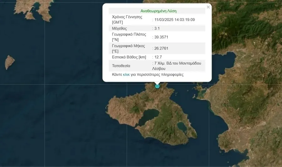 Νέος σεισμός στην Ελλάδα και συγκεκριμένα στην Μυτιλήνη.