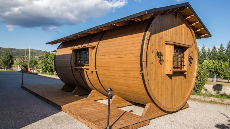 Το barell house είναι εξ’ ολοκλήρου φτιαγμένο από ξύλο, με δυνατότητα φιλοξενίας έως 6 άτομα. Ουσιαστικά πρόκειται για ένα ξύλινο σπιτάκι σε σχήμα βαρελιού με όλες τις ανέσεις.