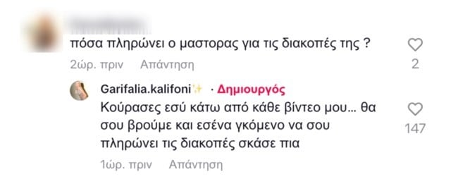 Όλα ξεκίνησαν όταν κάτω από ένα βίντεο – μήνυμα που η ίδια απηύθυνε σε άνθρωπο που υπήρξε στο παρελθόν στη ζωή της, χρήστης σχολίασε με ειρωνεία: «Πόσα πληρώνει ο Μάστορας για τις διακοπές σου;». Το σχόλιο αυτό φαίνεται πως αποτέλεσε την “σταγόνα που ξεχείλισε το ποτήρι”, αφού η Γαρυφαλλιά δεν άφησε την πρόκληση αναπάντητη.