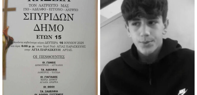 Σε κλίμα βαθιάς θλίψης τελείται σήμερα, Δευτέρα 17 Ιουνίου 2025, η κηδεία του 15χρονου Σπύρου Δήμου, ο οποίος εντοπίστηκε νεκρός στον ποταμό Άραχθο. Η εξόδιος ακολουθία θα ψαλεί στις 6 το απόγευμα στον Ιερό Ναό Αγίας Παρασκευής, στην Αγία Παρασκευή Άρτας.
