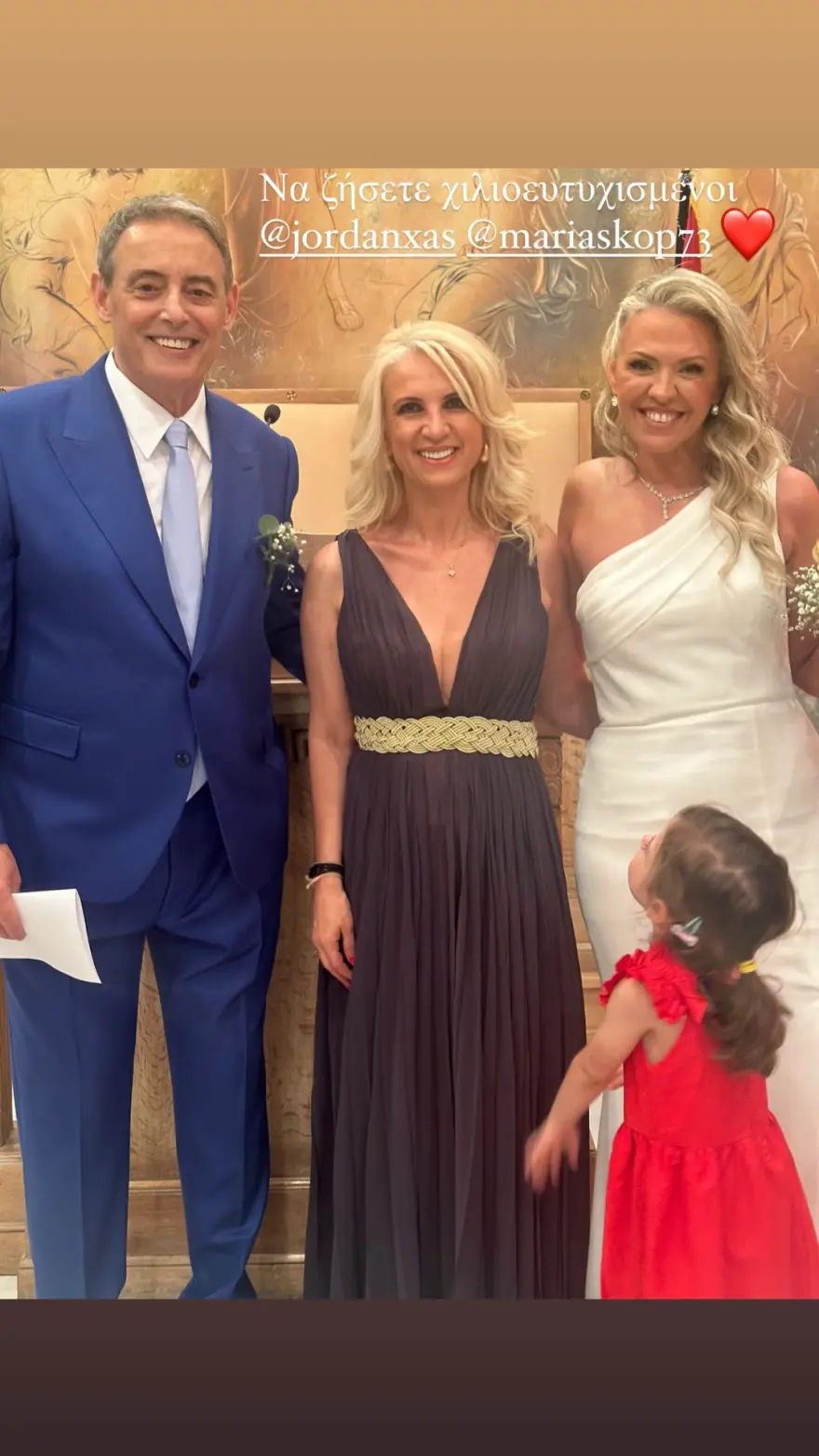 Στη σχετική φωτογραφία που ανάρτησε η σχεδιάστρια στο Instagram, ο Ιορδάνης Χασαπόπουλος ποζάρει χαμογελαστός φορώντας ένα μπλε σκούρο κοστούμι δίπλα στη Μαρία Σκοπελίτου, η οποία επέλεξε ένα λευκό νυφικό σε στενή γραμμή.