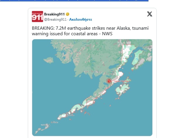 Η προειδοποίηση για τσουνάμι ισχύει για τη Νότια Αλάσκα, τη Χερσόνησο της Αλάσκας και την είσοδο Κένεντι μέχρι τη διώρυγα Ουνίμακ, στην ακτή του Ειρηνικού.