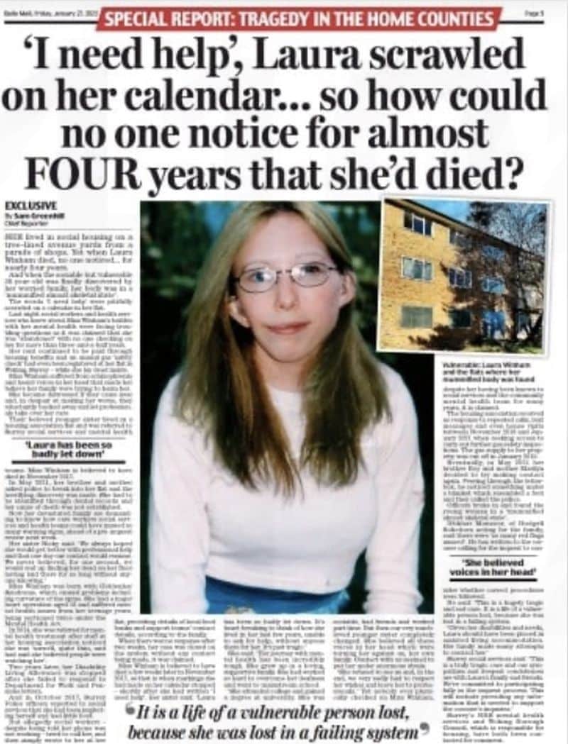 Η Λόρα βρέθηκε νεκρή σε ηλικία 38 ετών στο διαμέρισμα που διατηρούσε στο Γουόκινγκ του Σάρεϊ. Οι κοινωνικές υπηρεσίες και οι γιατροί που την εξέταζαν αδιαφόρησαν για την περίπτωση της. Σύμφωνα με το οικογενειακό της περιβάλλον η γυναίκα μεγάλωσε με αγάπη, αργότερα ξεκίνησε να ακούει φωνές πως οι γύρω της ήθελαν να την βλάψουν και η οικογένεια της πήρε την απόφαση να αφήσει την τύχη της στα χέρια των ειδικών.