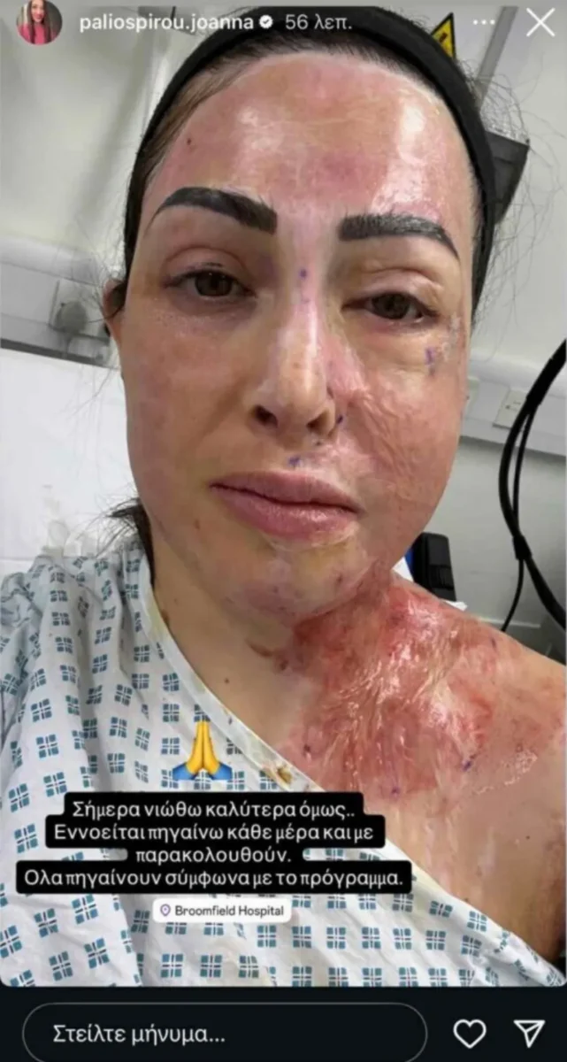 Η Ιωάννα Παλιοσπύρου λοιπόν, στις τελευταίες της αναρτήσεις έδειξε τις ουλές της και το αποτέλεσμα των θεραπειών με λέιζερ, ενώ είναι φανερό ότι το δέρμα της είναι αρκετά ερεθισμένο. Μάλιστα, όπως παραδέχτηκε, ήταν μια επίπονη διαδικασία, με την ίδια να γράφει: «Εχθές εξαφανίστηκα γιατί… βλέπετε. Πήρα πολλά παυσίπονα και δέχτηκα πολλή ενέργεια laser… Σήμερα νιώθω καλύτερα όμως… Εννοείται πηγαίνω κάθε μέρα και με παρακολουθούν. Όλα πηγαίνουν σύμφωνα με το πρόγραμμα».