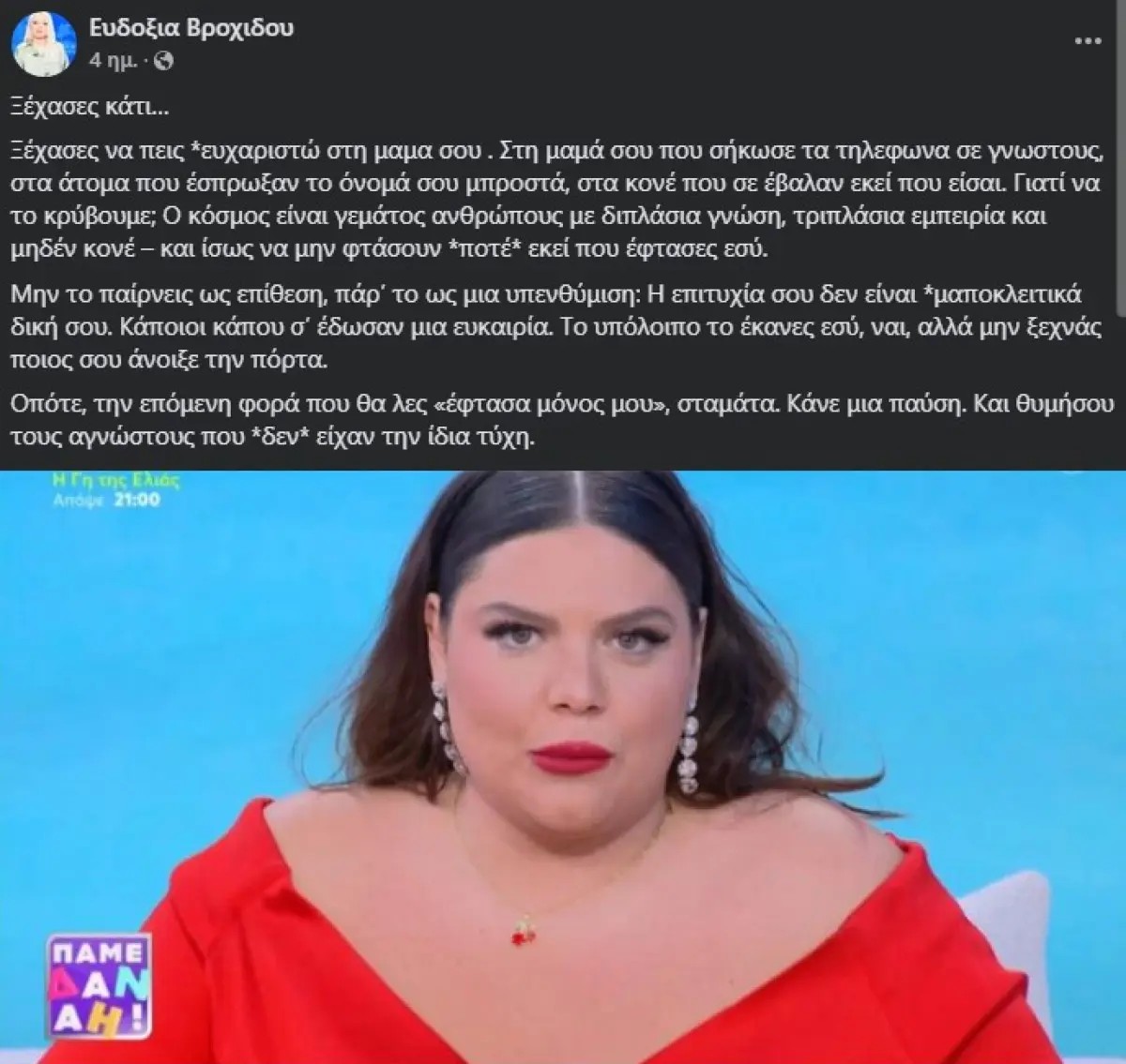 Οπότε, την επόμενη φορά που θα λες «έφτασα μόνος μου», σταμάτα. Κάνε μια παύση. Και θυμήσου τους αγνώστους που *δεν* είχαν την ίδια τύχη», έγραψε χαρακτηριστικά και πλήθος κόσμου στα σχόλια έσπευσαν να εκφράσουν την δική τους άποψη. Άλλοι συμφώνησαν μαζί της και κατέκριναν την παρουσιάστρια, ενώ άλλοι την υπερασπίστηκαν έντονα.