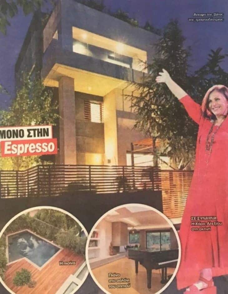 Στο ισόγειο βρίσκονται τα σαλόνια, με θέα στον κήπο και στην πισίνα και στους δύο άλλους ορόφους οι κρεβατοκάμαρες. Την δε παράσταση κλέβει το roof garden της μονοκατοικίας με την υπέροχη θέα. Η Χάρις Αλεξίου, η οποία δεν αγαπά καθόλου την επίδειξη, αγόρασε πριν από μερικά χρόνια το συγκεκριμένο σπίτι, όπως αναφέρει η Espresso, για επένδυση. Η ίδια δεν έμεινε ποτέ εκεί και κατοικεί σε ένα απλό και άνετο διαμέρισμα στη Φιλοθέη, που νοικιάζει στην περιοχή του Tennis Club.