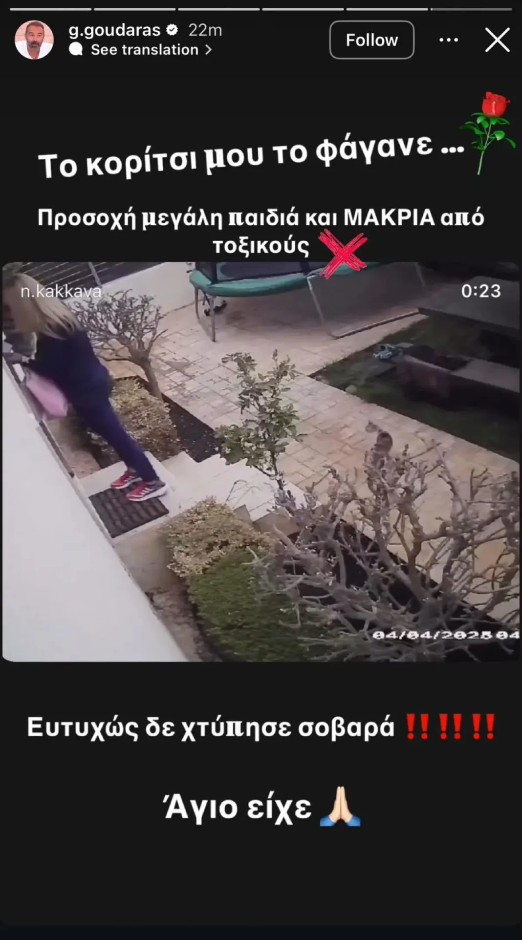Την ίδια πεποίθηση φαίνεται πως συμμερίζεται και η σύζυγός της Ναταλί Κάκκαβα, Γρηγόρης Γκουντάρας, ο οποίος απέδωσε το ατύχημα της αγαπημένης του σε κακό μάτι. Ο δημοσιογράφος κοινοποίησε την ανάρτησή της σημειώνοντας τα εξής: «Το κορίτσι μου το φάγανε… Προσοχή μεγάλη παιδιά και μακριά από τοξικούς. Ευτυχώς δεν χτύπησε σοβαρά, Άγιο είχε», σημείωσε.