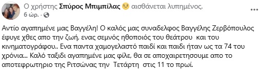 Όπως έγραψε ο βουλευτής και ηθοποιός: «Αντίο αγαπημένε μας Βαγγέλη! Ο καλός μας συνάδελφος Βαγγέλης Ζερβόπουλος έφυγε χθες από τη ζωή, ένας σεμνός ηθοποιός του θεάτρου και του κινηματογράφου. Ένα πάντα χαμογελαστό παιδί και παιδί ήταν ως τα 74 του χρόνια. Καλό ταξίδι αγαπημένε μας φίλε, θα σε αποχαιρετήσουμε από το αποτεφρωτήριο της Ριτσώνας τις επόμενες μέρες».