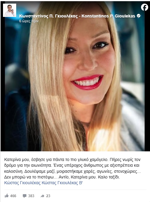 «Αντίο γλυκειά Κατερίνα μας!΅Καλό ταξίδι στο φως! Το σύντομο πέρασμα σου από τον μάταιο τούτο κόσμο ήταν σαν το χαμόγελο σου! Ζεστό, ευεργετικό για τους γύρω σου, γεμάτο ενέργεια και καλοσύνη! Όπως και το πέρασμα σου από την Δημοσιογραφία! Ο Θεός να δίνει δύναμη στους δικούς σου, στην υπέροχη οικογένεια σου! Καλή ανάπαυση φιλαράκι μου!»