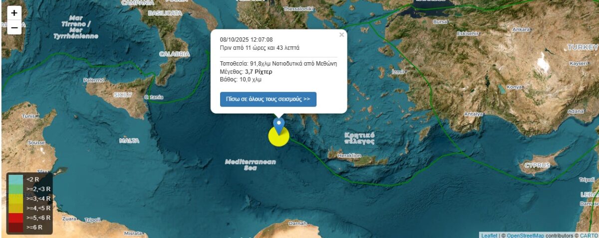 Σύμφωνα με πρώτες πληροφορίες, σεισμός 3,7 Ρίχτερ 91,8χλμ Νοτιοδυτικά από Μεθώνη στις 08/10/2025 12:07:08