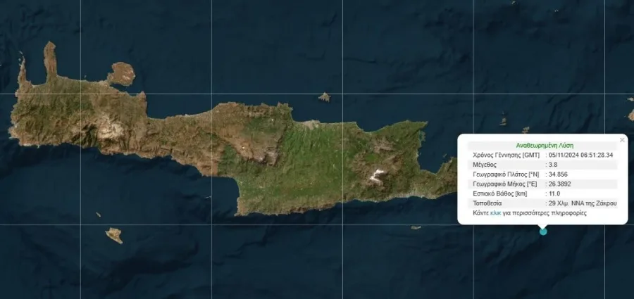 Νέα σεισμική δόνηση σημειώθηκε σήμερα νότια της Κρήτης.