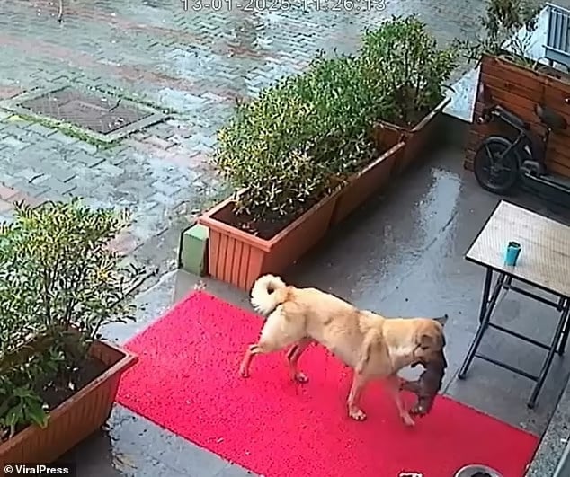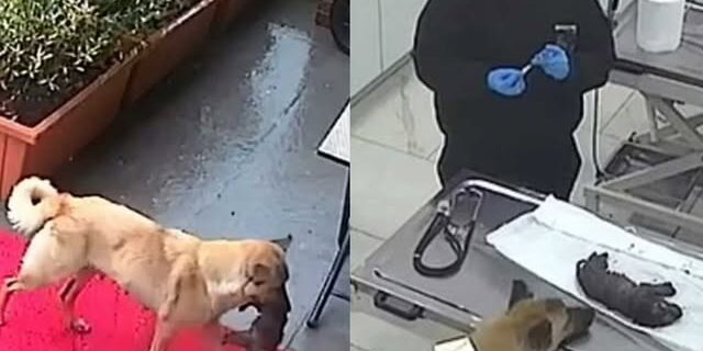 Το υλικό από κάμερες ασφαλείας δείχνει την αδέσποτη σκυλίτσα να μεταφέρει το εξαντλημένο κουτάβι της στο στόμα, μέσα στη βροχή και να το αφήνει στην πόρτα κτηνιατρικής κλινικής στην περιοχή Ατνάν Καβέτσι, στο Μπεϊλικούζου, στην επαρχία Κωνσταντινούπολης.