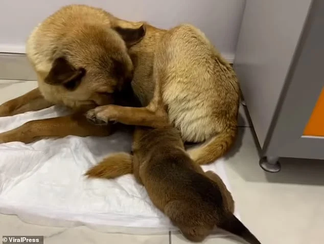Η σκυλίτσα παρέμεινε κοντά, παρακολουθώντας κάποιες φορές το κουτάβι της, ενώ οι κτηνίατροι προσπαθούσαν να το σώσουν πάνω στο τραπέζι θεραπείας.