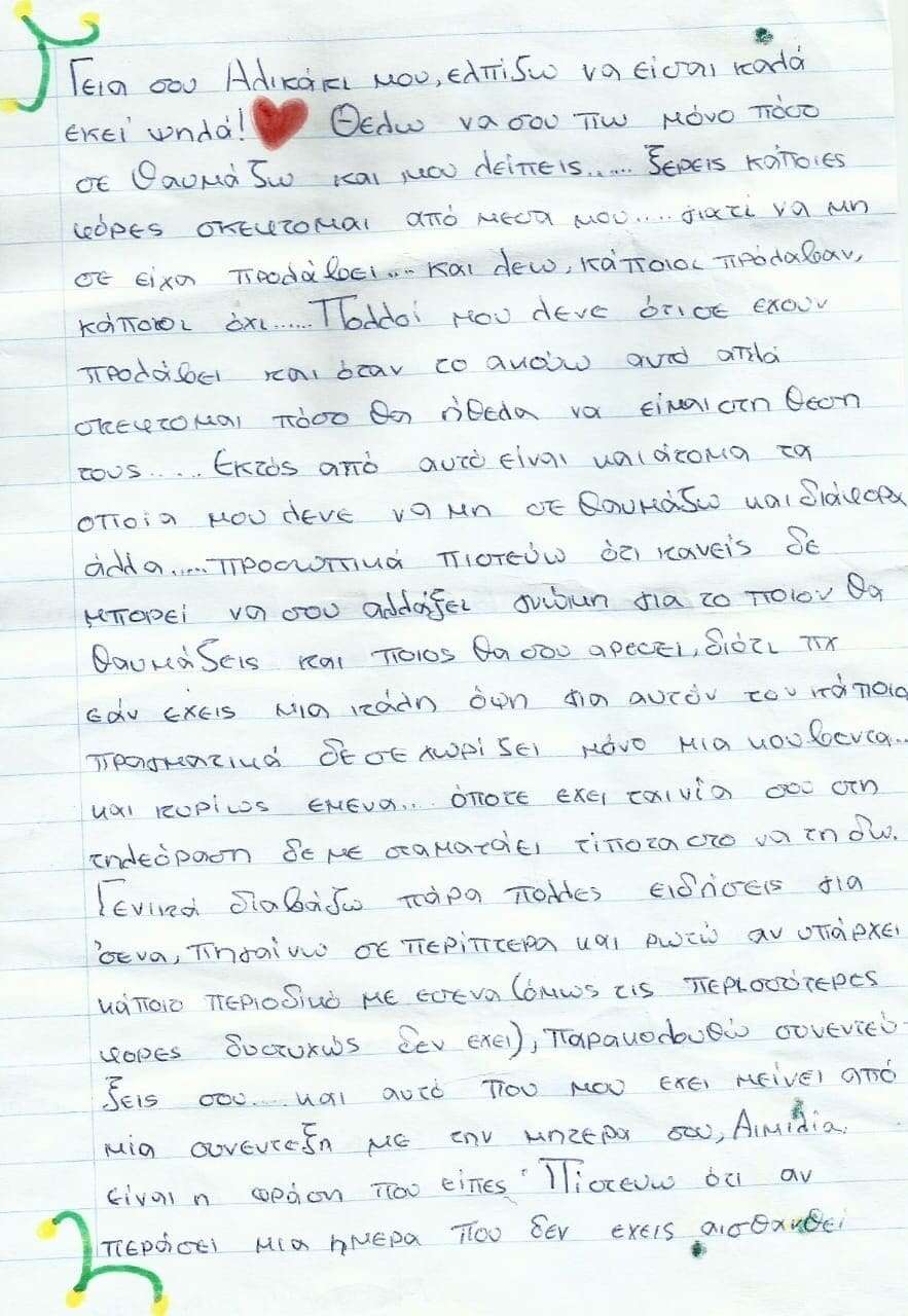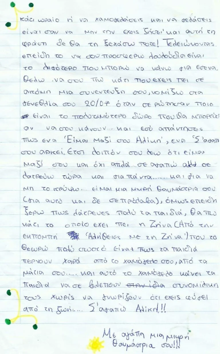 Με συγκινητικά λόγια απευθύνεται στο είδωλο της, την Αλίκη Βουγιουκλάκη, που δεν της έδωσε τη δυνατότητα ο Θεός να τη γνωρίσει καθότι η ίδια αναφέρει στο σημείωμα της, είναι μικρή σε ηλικία.
