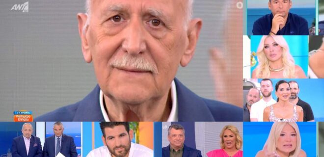 «Σήμερα είναι μία ιδιαίτερα φορτισμένη ημέρα για τον ΑΝΤ1, αλλά και για εμένα. Με έχει τιμήσει με τη φιλία του, έχουμε κάνει μαζί διακοπές, έχουμε βγει έξω… Σε αυτό τον άνθρωπο που τον βλέπω και ανατριχιάζω… Έβαλα κι εγώ τα κλάματα πριν στο καμαρίνι μου όταν τον έβλεπα. Ο άνθρωπος αυτός είναι το μεγαλύτερο κομμάτι της ιστορίας της ελληνικής τηλεόρασης.