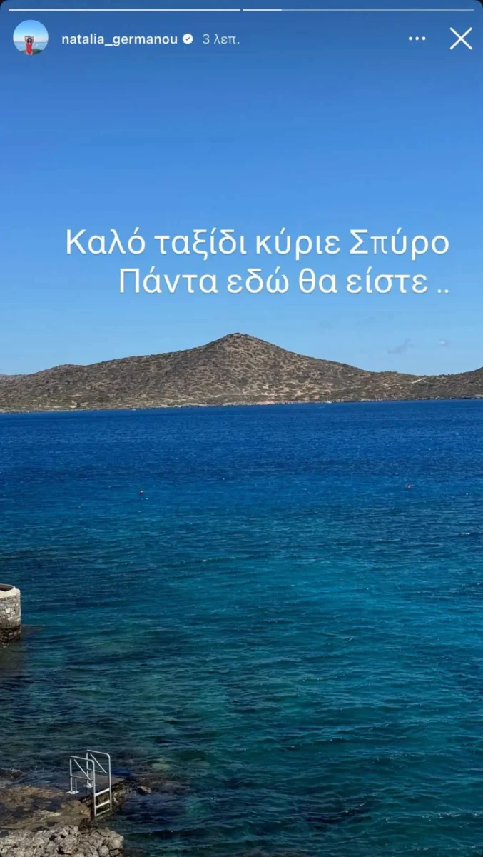 Συγκεκριμένα, μοιράστηκε με τους διαδικτυακούς της φίλους μια φωτογραφία της θάλασσας και έγραψε «Καλό ταξίδι κύριε Σπύρο. Πάντα εδώ θα είστε», χωρίς να δίνει περισσότερες πληροφορίες σχετικά.