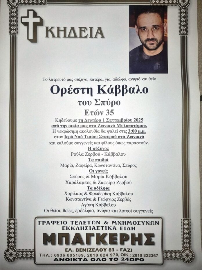 Βαρύ πένθος έχει σκεπάσει την κοινωνία των Ζωνιανών, μετά τον αιφνίδιο θάνατο του Ορέστη Κάββαλου σε ηλικία μόλις 35 ετών, πατέρα 4 παιδιών.