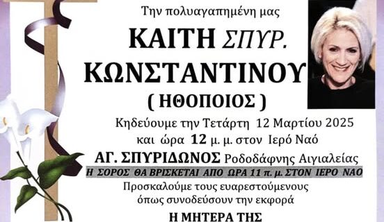 Ο ηθοποιός και βουλευτής αποκάλυψε πως η κηδεία της Καίτης Κωνσταντίνου θα πραγματοποιηθεί αύριο Τετάρτη 12 Μαρτίου στο Αίγιο. Φίλοι, συγγενείς και συνάδελφοι θα ταξιδέψουν έως το Αίγιο για να αποχαιρετήσουν την Καίτη Κωνσταντίνου.
