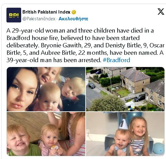 Μια φρικτή τραγωδία εκτυλίχθηκε στο Μπράντφορντ της Βρετανίας, όταν φωτιά που ξέσπασε μέσα στη νύχτα στοίχισε τη ζωή σε μια νεαρή μητέρα και τα τρία ανήλικα παιδιά της.