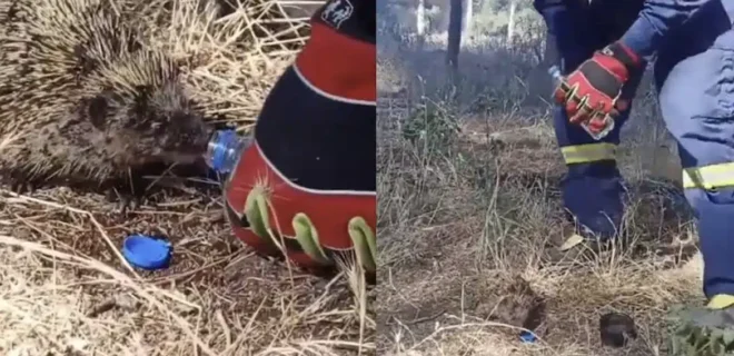 Συγκεκριμένα, σε ένα βίντεο που κάνει τις τελευταίες ώρες τον γύρο του διαδικτύου, φαίνεται ένας πυροσβέστης να σκύβει και να προσφέρει νερό με το μπουκαλάκι του σε ένα σκαντζοχοιράκι που σώθηκε από την πύρινη λαίλαπα.