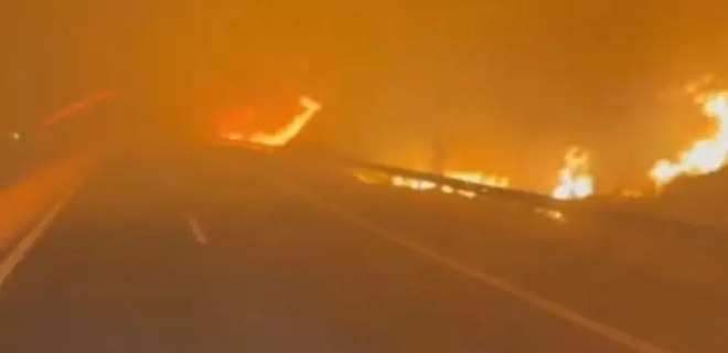 Σε βίντεο που ανάρτησε το MeteoHellas στα κοινωνικά δίκτυα, φαίνεται οδηγός να περνά μέσα από «διαδρόμους» φωτιάς, με τις φλόγες να αγγίζουν σχεδόν το οδόστρωμα. Η ατμόσφαιρα είναι αποπνικτική, με τον πυκνό καπνό να περιορίζει την ορατότητα και να καλύπτει κάθε σημείο γύρω από το δρόμο.
