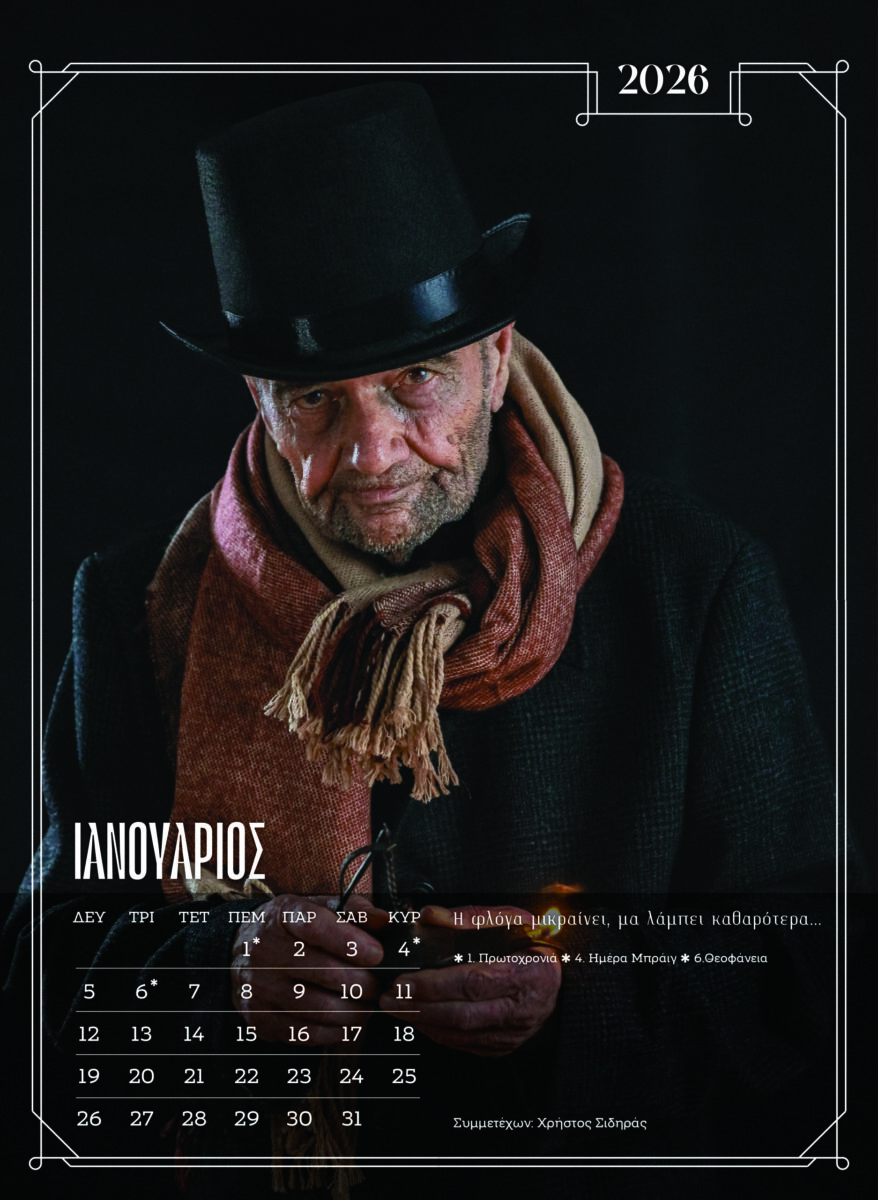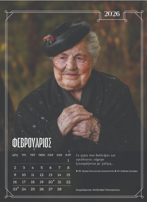 Τον Ιανουάριο, ο Χρήστος Σιδηράς ανοίγει τη χρονιά ως μια «φλόγα που μικραίνει, μα λάμπει καθαρότερα» -μια μεταφορά για όλους εκείνους που ίσως κουράστηκαν, αλλά δεν έπαψαν ποτέ να φωτίζουν. Τον διαδέχεται η Αλεξάνδρα Τσιακίρογλου του Φεβρουαρίου, με τα χέρια που «δούλεψαν και αγκάλιασαν» και σήμερα διεκδικούν τη δική τους γαλήνη, σαν μια ανθρωπιά που αντέχει στον χρόνο.