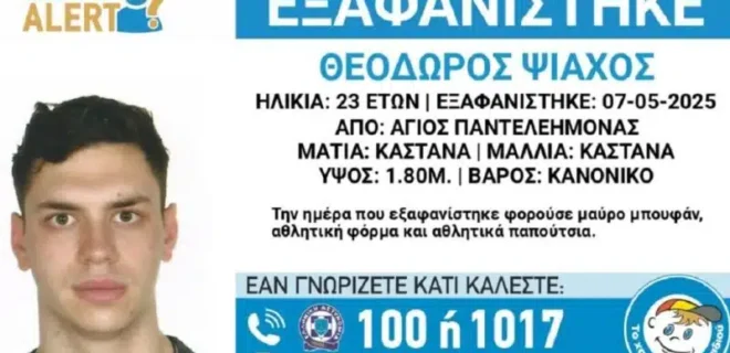Συναγερμός έχει σημάνει στις Αρχές από την εξαφάνιση του 23χρονου Θεόδωρου Ψιάχου το βράδυ της Τετάρτης (07/05/2025) από τον Άγιο Παντελεήμονα, όμως ανακοίνωσε το «Χαμόγελο του Παιδιού».