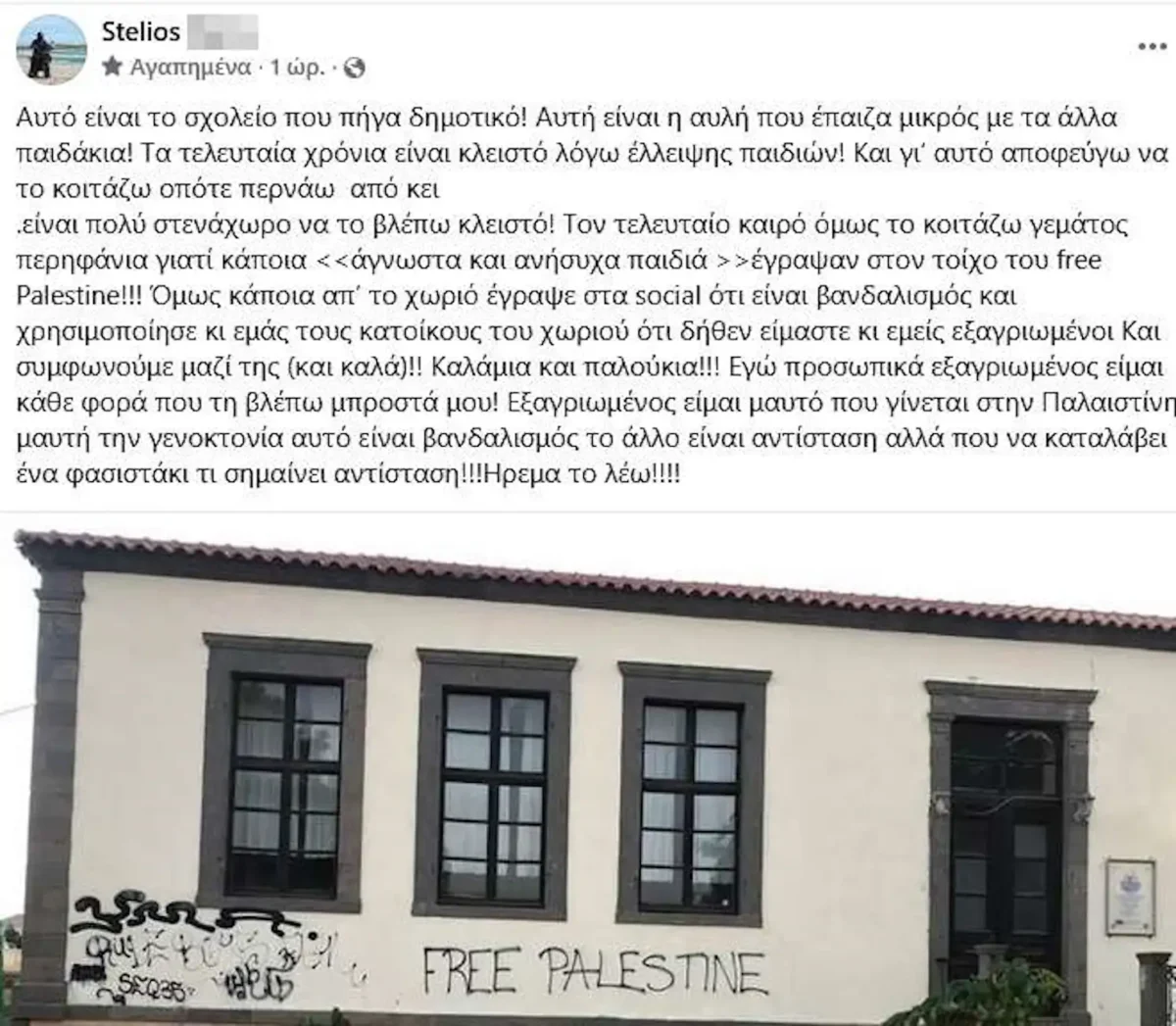 Τον τελευταίο καιρό όμως το κοιτάζω γεμάτος περηφάνια γιατί κάποια “άγνωστα και ανήσυχα παιδιά” έγραψαν στον τοίχο του “Free Palestine!!!”. Όμως κάποια απ’ το χωριό έγραψε στα social ότι είναι βανδαλισμός και χρησιμοποίησε κι εμάς τους κατοίκους του χωριού ότι δήθεν είμαστε κι εμείς εξαγριωμένοι. Και συμφωνούμε μαζί της (και καλά)! Καλάμια και παλούκια!