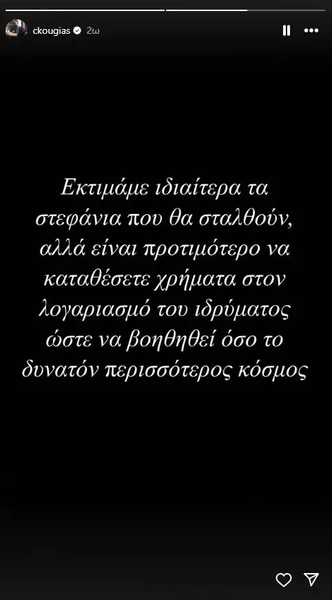 Με νέες αναρτήσεις σήμερα, Καθαρά Δευτέρα 3 Μαρτίου, ο γιος του Αλέξη Κούγια ενημερώνει πως επιθυμία της οικογένειας είναι αντί στεφάνων να πραγματοποιηθούν δωρεές στο Σωματείο «Ελπίδα Σύλλογος Φίλων Παιδιών με Καρκίνο»