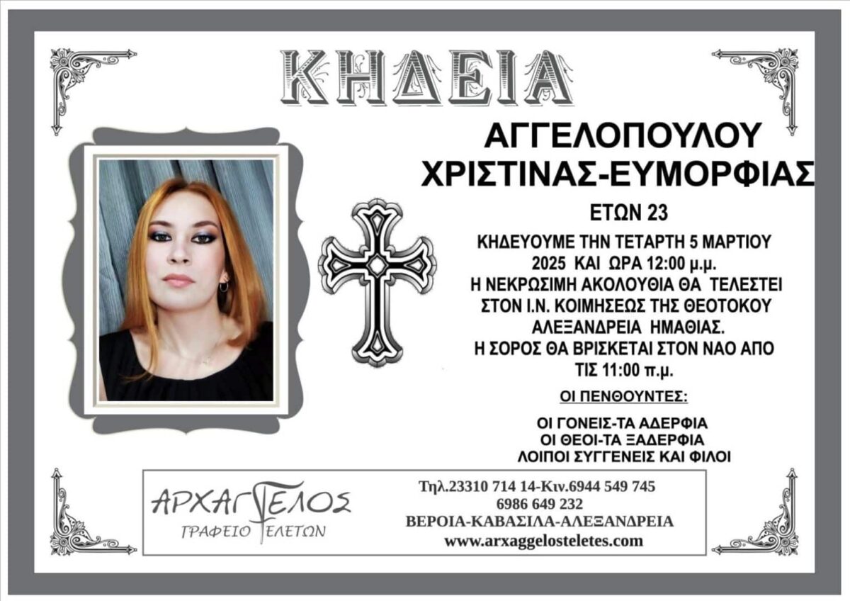 Η κηδεία της θα γίνει την Τετάρτη 5 Μαρτίου 2025 στις 12.00 μ.μ. από τον Ιερό Ναό Κοιμήσεως της Θεοτόκου στην Αλεξάνδρεια Ημαθίας.