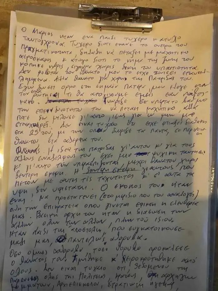 «Ο Μάριος ήταν ένα παιδί τυχερό και άτυχο ταυτόχρονα. Τυχερό διότι έκανε το όνειρό του πραγματικότητα δηλαδή να πετάξει με μαχητικό αεροσκάφος και άτυχο διότι το νήμα της ζωής του κόπηκε νωρίς σίγουρα χωρίς δική του υπαιτιότητα. Δεν φοβόταν το θάνατο μου το είχε τονίσει επανειλημμένα, αλλά θάνατο για χάρη της πατρίδας του. Έχω δώσει όρκο στη σημαία πατέρα μου έλεγε, όταν τον είχα ρωτήσει τι θα απογίνουμε εμείς αν πάθει κάτι».