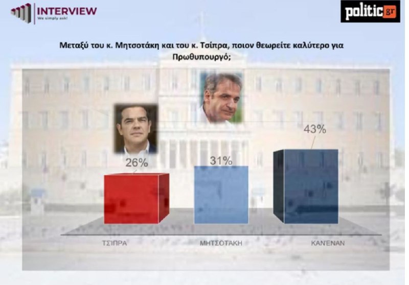 Σε απόσταση αναπνοής ο Αλέξης Τσίπρας στην καταλληλότητα για πρωθυπουργία, χωρίς ακόμη να έχει ανακοινώσει τις προθέσεις του – Μεγάλες απώλειες για τον Κυριάκο Μητσοτάκη στην ερώτηση «ποιον πολιτικό αρχηγό εμπιστεύεστε περισσότερο για τη διακυβέρνηση της χώρας»