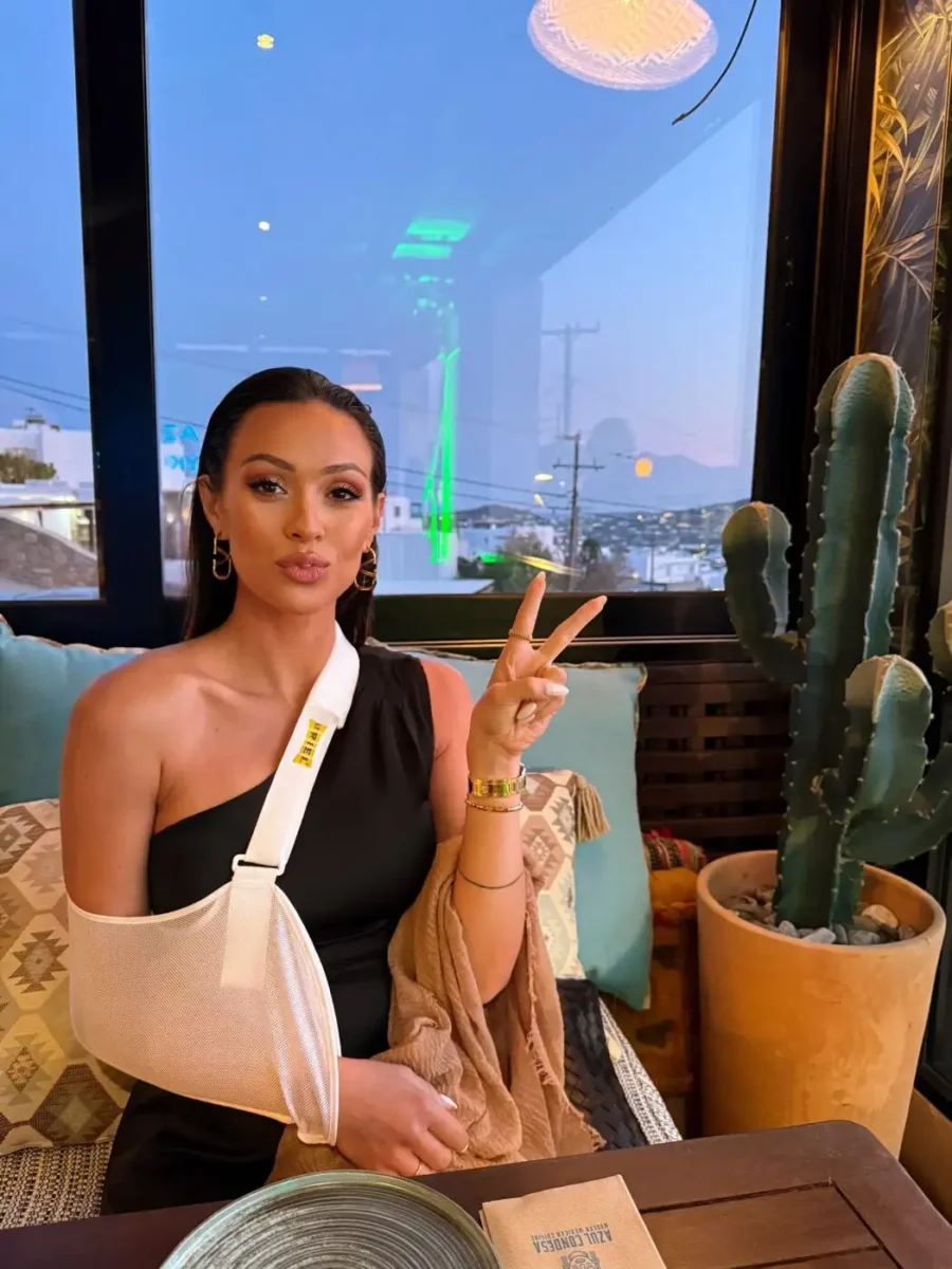 Την αποκάλυψη έκανε η ίδια μέσα από μια ανάρτηση στο Instagram το απόγευμα της Τετάρτης 11 Ιουνίου, την οποία συνόδευσε με φωτογραφίες από τις διακοπές της στη Μύκονο, στις οποίες όπως θα δεις, είχε δεμένο το χέρι της.