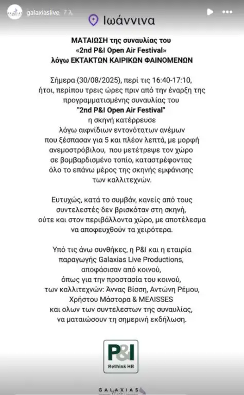 «Ματαίωση της συναυλίας του “2nd P&I Open Air Festival» λόγω έκτακτων καιρικών φαινομένων.