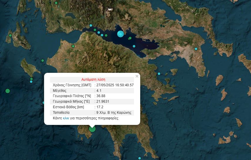 Σεισμός μεγέθους 4,2 βαθμών της κλίμακας Ρίχτερ σημειώθηκε το απόγευμα της Τρίτης (27/5) στην Μεσσηνία.